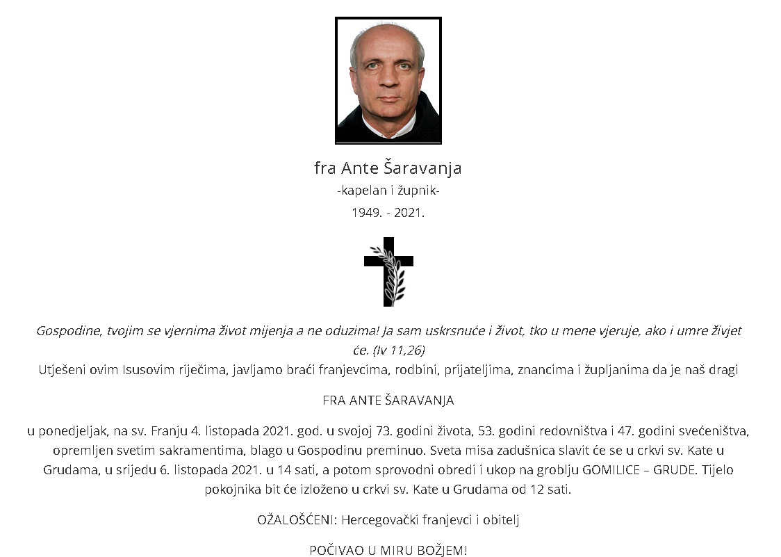 Na blagdan Svetog Franje, 4. listopada, prigrlivši svoj teški križ, svom Gospodinu, svom Kristu u zagrljaj otišao je fra Ante Šaravanja, svećenik župe Grude, njen župnik od 1982. do 1985., i jedan od najboljih propovijednika u Hercegovini.