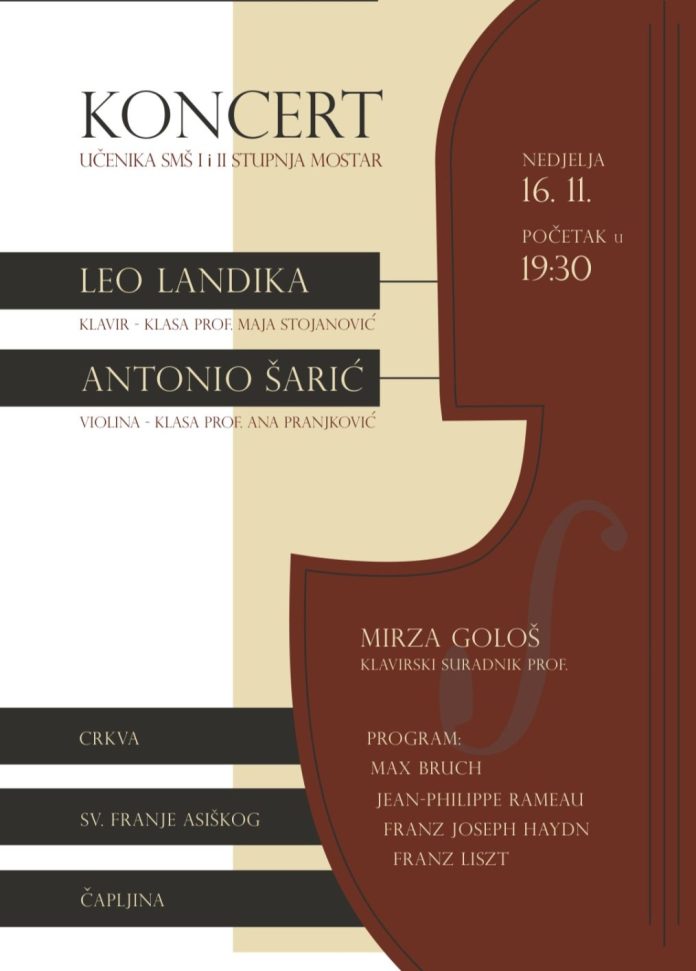 U nedjelju, 16. studenoga 2025. godine s početkom u 19:30 sati, u crkvi svetog Franje Asiškog u Čapljini, održat će se koncert učenika Srednje muzičke škole I i II stupnja Mostar na kojem će nastupiti mladi talentirani glazbenici: